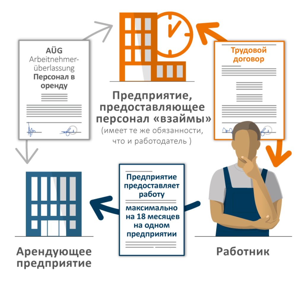 Период времени, на который работник «передается в аренду», может сильно различаться. Работа может длиться несколько дней или несколько месяцев. Вы будете отданы в аренду различным компаниям/предприятиям на определенный период времени. По закону временным работникам не разрешается работать в одной компании более 18 месяцев единовременно (непрерывно). Кроме случаев, когда в тарифном договоре было оговорено, что временные работники могут оставаться в компании более 18 месяцев. После 3-месячного периода ожидания вы снова сможете трудоустроиться в компанию (поэтому между периодами работы должен быть перерыв). Компания-наниматель также может трудоустроить вас на постоянной основе в своей компании через 18 месяцев (или раньше).